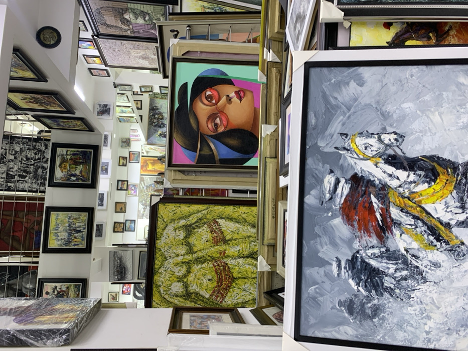 The scene depicts the interior of an art gallery or commercial art space located in Ikate, Nigeria