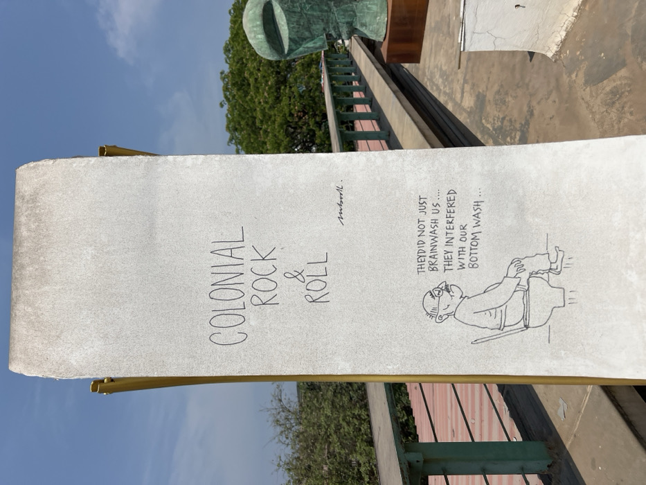 A white rectangular sign with rounded edges is mounted on a golden-colored metal pole. The sign has black marker writing on it that reads "COLONIAL ROCK & ROLL", followed by a signature that reads "Mucholl." Underneath this is a black marker drawing of a man sitting on a toilet. The drawing is accompanied by a black marker caption that reads "THEY DID NOT JUST BRAINWASH US... THEY INTERFERED WITH OUR BOTTOM WASH..." The sign is partially obscured by a green metal railing on the left. The railing is on a concrete rooftop with a light orange roof behind it. On the right side of the image, a green stone sculpture is in front of a white rectangular sign, both partially obscured by the metal railing. The rooftop is in a clear, sunny, and dry environment. There are no people present. The location is a rooftop in Mumbai, India.