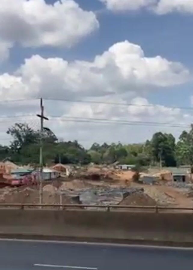 The video, shot from a moving vehicle, shows a construction site next to a highway