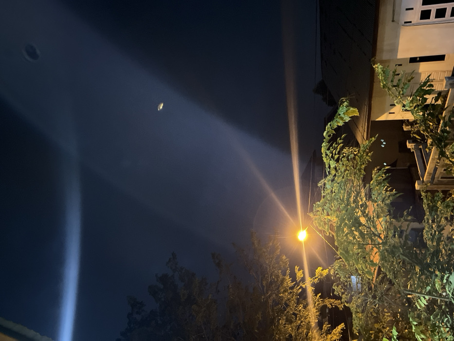 Night scene featuring a building with dark awnings and upper floor windows, partially obscured by abundant green foliage on the right. A streetlamp shines brightly, with rays extending across the frame. In the dark blue sky, there are a couple of visible objects including a circular spot and an oval-shaped object. A vertical beam of light emanates from the lower-left corner, adding a dramatic effect. Trees with sparse leaves are scattered in the midground.