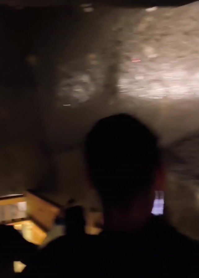 group of people walking inside a cavernous space. The walls appear to be natural stone, and there is a wooden railing along the path. A sign with a stick figure pointing in a direction is visible. The lighting is dim, and the camera is shaky, suggesting it is handheld.