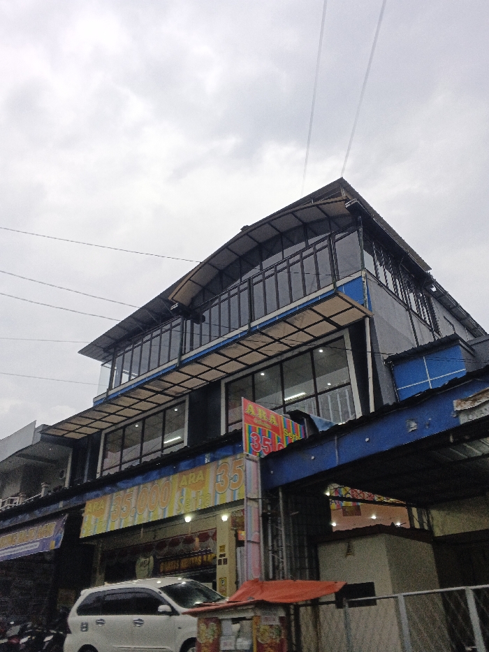 An outdoor, street-level photograph depicts a multi-story commercial building in Carmen, Philippines, under an overcast sky. The building features a dark gray and black facade with blue accents on its lower levels, extensively utilizing glass windows on all visible floors. Projecting from the structure are multiple translucent awnings supported by dark frames. The topmost floor has a distinctive sloped roof design and large windows. Prominent yellow and red signage on the lower level displays "ARA 35.000" and "ARA 35h," with a vertical red and green sign also featuring "ARA" and "35h" positioned at the second-floor level. In the foreground, a white multi-purpose vehicle is present on the street, and a small vendor cart with an orange canopy is visible to its right. A metal fence runs along the immediate foreground. Overhead utility lines traverse the cloudy sky. No individuals are distinctly visible.