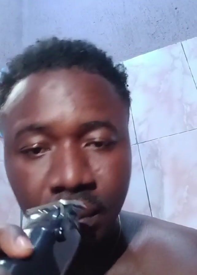 close-up of a dark-skinned man using an electric razor to shave his mustache. He is shirtless and appears to be in a bathroom or a room with tiled walls. The man has short, curly black hair and a thin gold chain around his neck with a cross pendant. His expression is focused as he trims his facial hair. The camera remains close to his face throughout the video.