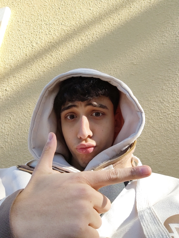 A young man poses in front of a textured wall with a sunny highlight. He wears a hooded sweatshirt, the hood pulled up. He has dark curly hair and brown eyes. His lips are pursed. His right hand is extended towards the camera in a gesture, with his index and middle fingers extended to the right. The sweatshirt is light-colored with brown accents.