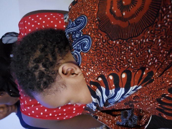 A baby with curly black hair rests their head against a red and white polka dot fabric. The baby's ear is visible. An adult partially obscured on the left holds the baby. A vibrant patterned fabric, primarily red with blue and black accents, is draped over the baby. The fabric has a distinct African-inspired design.