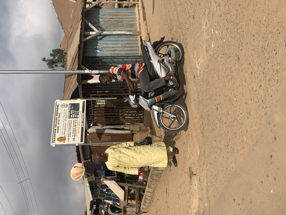 The image displays an outdoor street scene in Okengwe, Okene, Kogi State, Nigeria, under an overcast sky