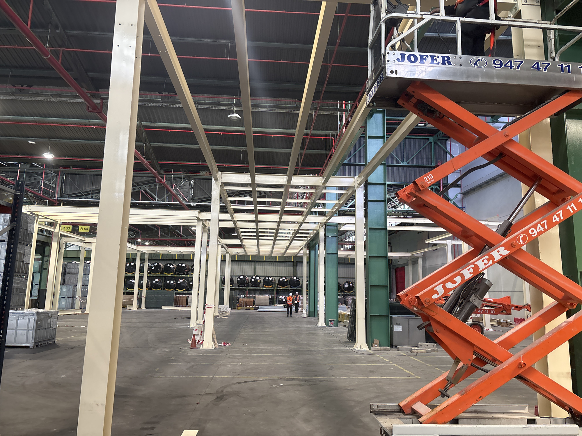 interior of an active industrial warehouse or factory in Burgos, Spain. This location is identified by the "JOFER" branding and phone number "947 47 11 10" visible on a piece of machinery, correlating to Jofer Elevación y Servicios, S.L., located in Burgos. In the foreground to the right, an orange hydraulic scissor lift is partially elevated, with a worker's lower body visible within its silver platform. The lift's chassis and platform display the "JOFER" logo and the aforementioned phone number, along with the equipment identification "213 / 30323" on its scissor mechanism. The facility features a high, dark corrugated metal ceiling crisscrossed by red fire suppression pipes and suspended industrial light fixtures. A grid of new light-beige steel support beams is being erected or is already in place, integrated with larger dark green structural columns. The concrete floor, marked with some yellow lines, appears well-used and shows some dust and minor debris. In the mid-ground, two individuals, likely workers, are visible walking away from the camera. Both wear orange high-visibility vests and white hard hats. The background features extensive industrial racking systems, heavily loaded with goods. Numerous dark, circular items (possibly coiled materials or tires) are stacked neatly on racks, alongside lighter metallic containers and pallets. Some racking sections are marked with yellow identification labels such as "R 53" and "R 54".