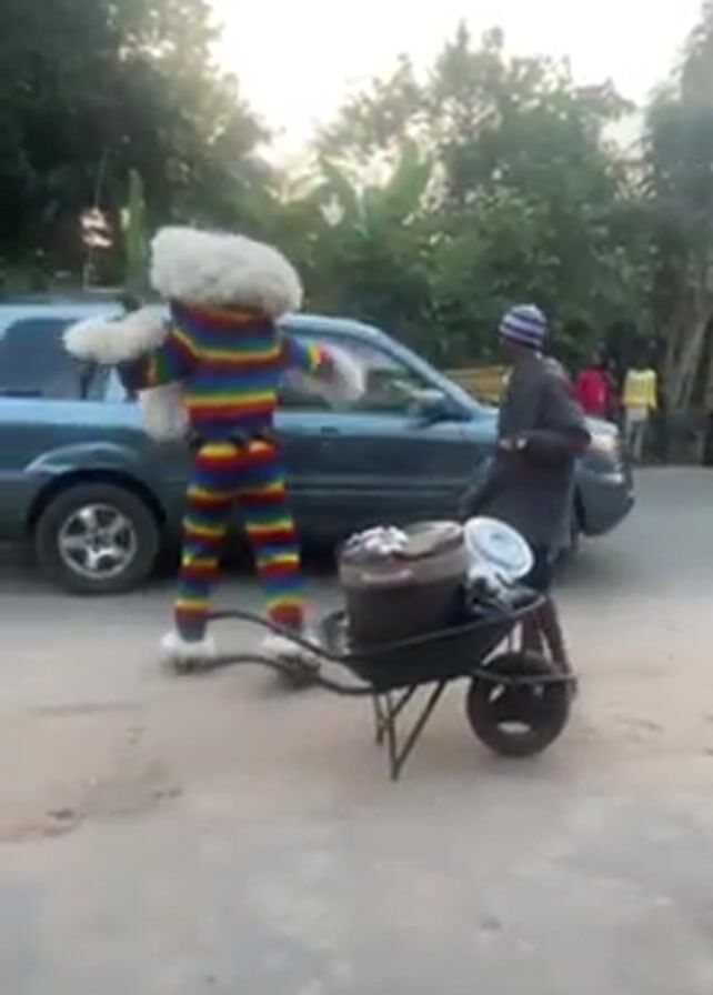 The video captures a street scene with a person in a colorful striped costume with white fur around the head, wrists, and feet. The costume has horizontal stripes of blue, green, yellow, orange, and red. The person in the costume is moving and appears to be gesturing. A man is standing nearby wearing a dark coat and a hat, pushing a wheelbarrow containing what appears to be cooking equipment. A blue SUV is parked behind them. There are several other people in the background, and some trees and foliage are visible. The lighting suggests it may be late afternoon or early morning. The scene appears to be taking place in an urban or semi-urban environment.