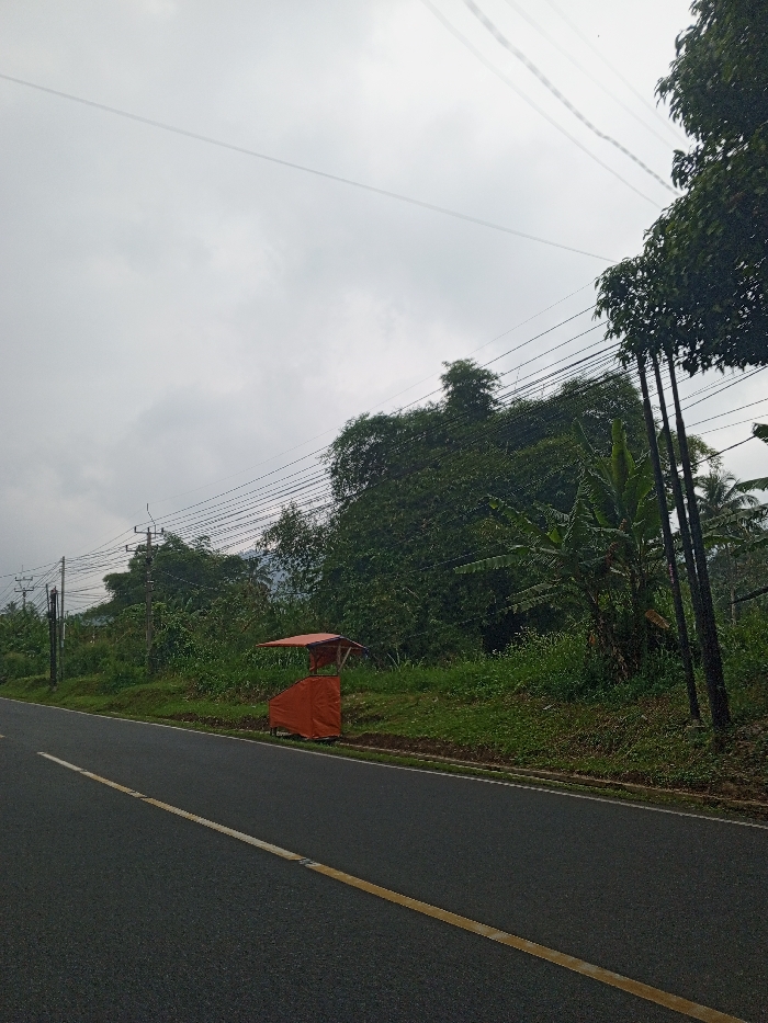 The scene displays an outdoor, roadside environment under an overcast grey sky. An asphalt road, marked with a solid yellow centerline, extends from the lower left foreground into the mid-ground. To the right of the road, a narrow strip of grassy embankment supports an unoccupied, orange-colored vendor cart with a wooden frame and an orange canopy. Behind this cart and along the right side of the road, dense green vegetation dominates, featuring large leafy trees, prominent bamboo stalks, and several broad-leafed plants resembling banana trees. Multiple utility poles stand upright, supporting numerous black electrical wires that stretch across the upper and mid-portions of the image, running parallel to the road. Distant landforms are faintly visible through the foliage and haze in the background. No individuals are present. This scene is located in Qorday, Kazakhstan.