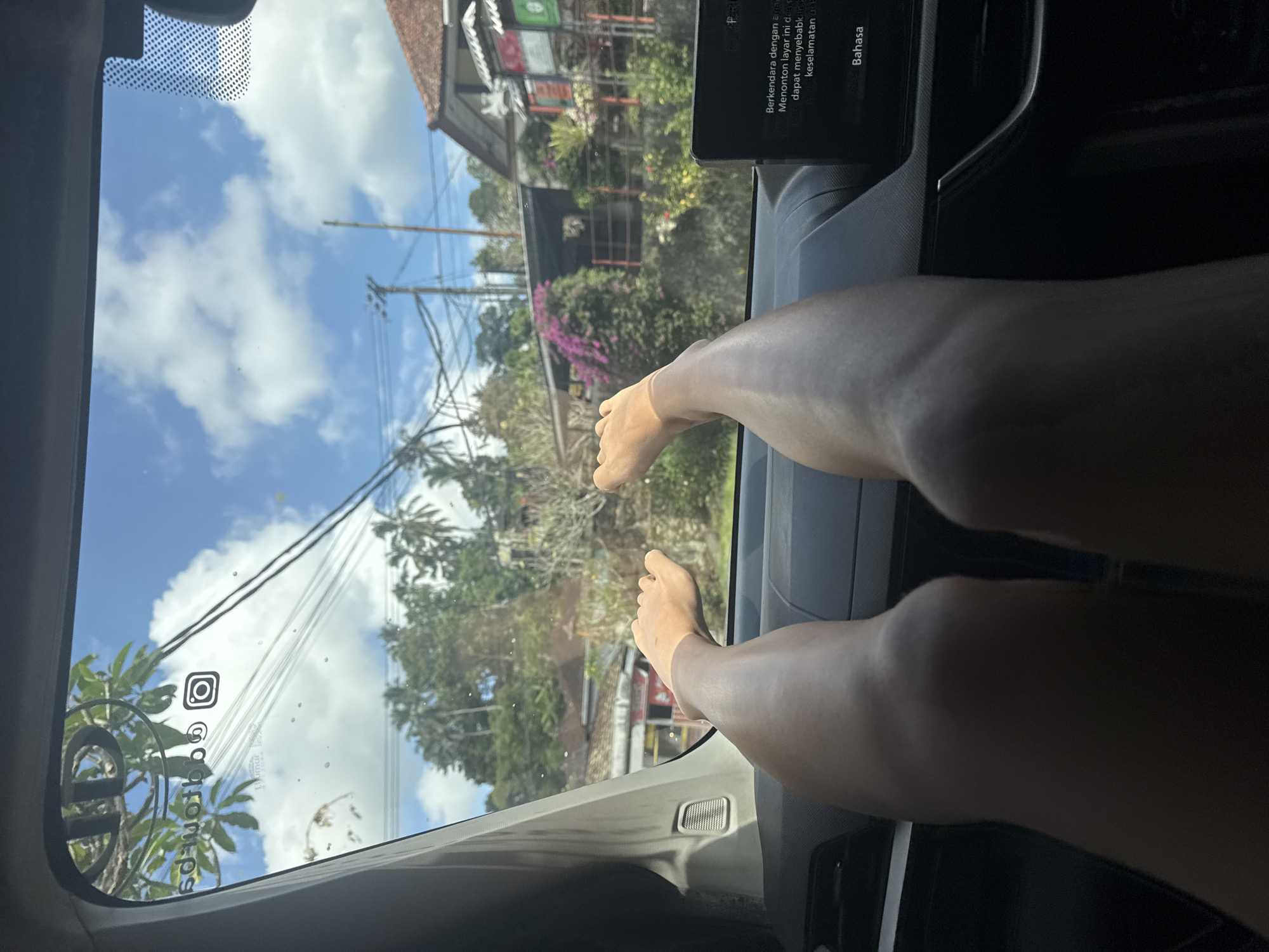The photograph shows the interior of a vehicle with a view through the window. A pair of legs are stretched across the dashboard. Outside the window, the scenery includes a bright blue sky, white clouds, trees, and buildings. There is a sticker of an Instagram logo and handle on the bottom of the window. In the dashboard is a screen showing text.