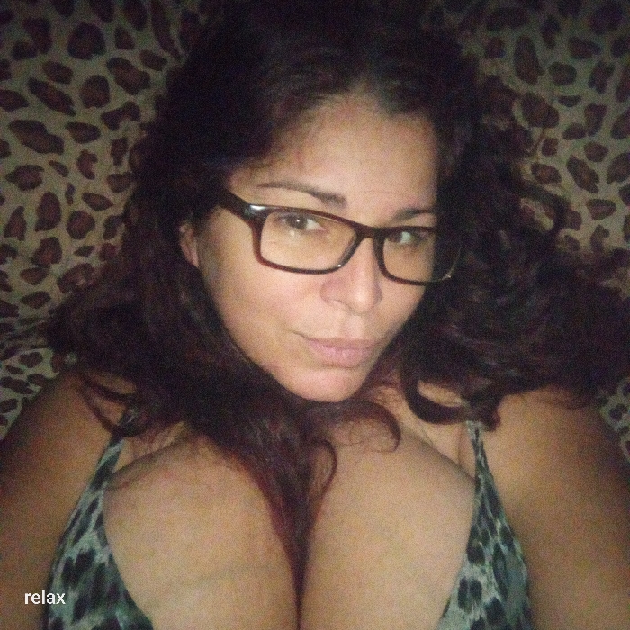 A woman wearing glasses gazes towards the camera, her dark hair framing her face. She is wearing a leopard print top. The backdrop appears to be a matching leopard print pattern. The word "relax" is in the lower left corner. The focus of the image is on her face and cleavage.