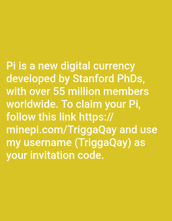 The image presents an advertisement for Pi, a digital currency developed by Stanford PhDs, claiming to have over 55 million members worldwide. It invites viewers to claim their Pi by following the provided link, "https://minepi.com/TriggaQay," and using the username "TriggaQay" as their invitation code. The text is displayed in white against a yellow background.