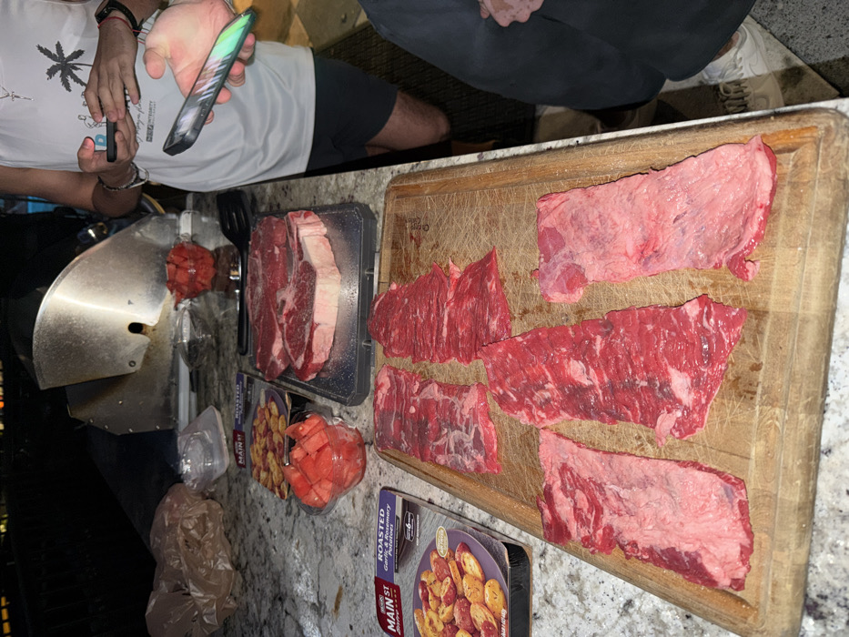 This image depicts an outdoor food preparation scene at night in Gainesville, United States of America. A granite-patterned countertop serves as the primary surface. On the counter, a large wooden cutting board displays multiple cuts of raw red meat, likely flank steak, prepped for cooking. To the upper right of the cutting board, a black plastic tray holds two thick, raw steaks. Two packages of "MAIN ST ROASTED Garlic & Rosemary Potatoes" are visible, along with two clear plastic containers filled with diced watermelon. A black spatula lies near the thicker steaks. In the background, a large stainless steel barbecue grill with its lid ajar is present. A brown plastic bag and other clear plastic containers are also on the countertop. Three individuals are partially visible. One person, wearing a white tank top with a palm tree graphic, black shorts, and a cross necklace, holds a dark-colored smartphone. Another person's hand, positioned in the foreground, holds a smartphone with a multi-colored reflective case. A third person's lower legs and feet, clad in dark attire and white sneakers, are visible on the right side of the frame.