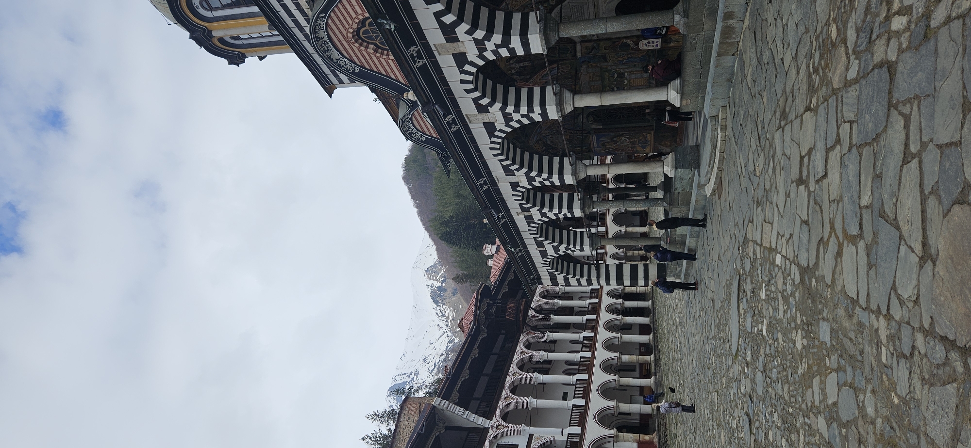 The image displays the central cobblestone courtyard of Rila Monastery (Rilski manastir) in Bulgaria, observed under an overcast sky. The foreground features an irregular grey stone pavement. To the right, the main church building exhibits a distinctive facade characterized by prominent black and white striped arches, supported by grey stone columns. Behind these arches, vibrant religious frescoes are visible. Several individuals, dressed in casual winter attire, are gathered near the church entrance; some stand observing, while others are seated on the lower stone platform. To the left, a multi-story monastic residential building rises, featuring multiple levels of white arched galleries with white columns and red-tiled roofs. A few individuals are scattered across the courtyard and near the monastic building. In the background, beyond the monastery structures, snow-capped mountains rise, partially obscured by evergreen trees and bare deciduous trees. No direct interactions between individuals are discernible; most appear to be observing the surroundings. The overall environment suggests a cool, possibly late winter or early spring day.