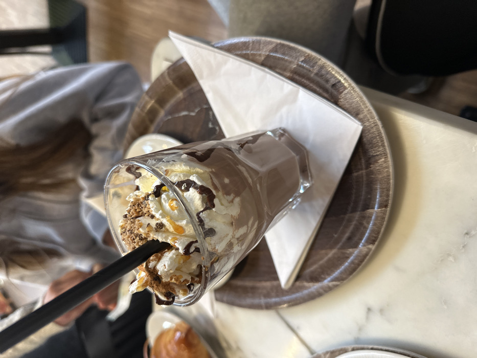 This image depicts an indoor scene within the city of Beringen, Luxembourg. The central object is a tall, clear, faceted glass containing a dark brown beverage, presumably a chocolate drink. The drink is generously topped with white whipped cream, which is drizzled with both dark chocolate syrup and a lighter, amber-colored syrup, and garnished with a sprinkling of small, light brown crushed nuts or crumbs. A black plastic drinking straw is vertically inserted into the center of the whipped cream. The glass rests on a folded white paper napkin, which is placed on a round, dark brown tray exhibiting a distinctive wood grain pattern. This tray occupies a significant portion of a light-colored, possibly marble, tabletop with subtle veining. In the immediate background to the left, a portion of a white plate with a golden-brown pastry, likely a croissant, is visible. Further in the blurred background, a person with light brown hair, wearing a light-colored (possibly white or light grey) long-sleeved garment, is partially visible, indicating an occupied dining space. A dark, possibly black, chair back is discernible in the far right background. The overall environment suggests a casual café or restaurant setting.