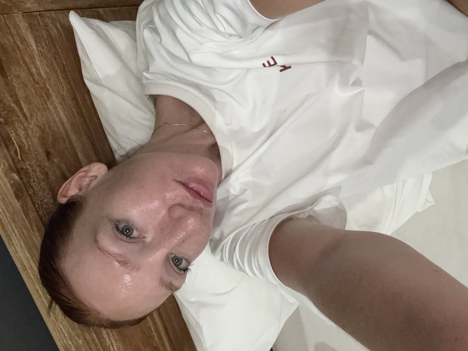 This image depicts an adult female positioned on her back within an indoor bedroom setting, located in Tibubeneng, Indonesia. She is observed lying on white sheets with her head resting on a white pillow. Her complexion is fair, with red hair pulled back from her face, revealing a visible sheen on her skin, particularly across her forehead and cheeks. Her eyes are light-colored, and she maintains direct eye contact with the viewer. She is attired in a plain white short-sleeved t-shirt, which bears an obscured red graphic or text on the right chest area, and a thin silver-toned chain necklace around her neck. Directly behind her head is a light-colored wooden headboard, constructed from horizontal planks. Above the headboard, a dark-colored wall is visible. The scene is evenly lit by what appears to be an artificial light source, characteristic of an indoor environment.