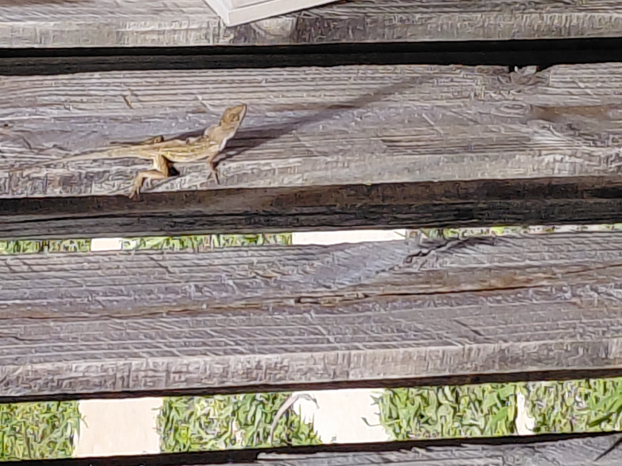 A tan lizard perches on a weathered wooden plank