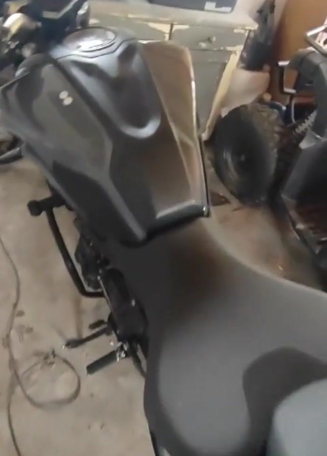 motorcycle and an ATV in an indoor setting, likely a garage. The motorcycle is a dark gray color with a black seat. The ATV is red and black, with the name "VENUM" printed on the side. The floor is concrete and appears to be somewhat dirty. There are various other objects visible in the background, including storage containers and tools. The camera moves slightly during the recording.