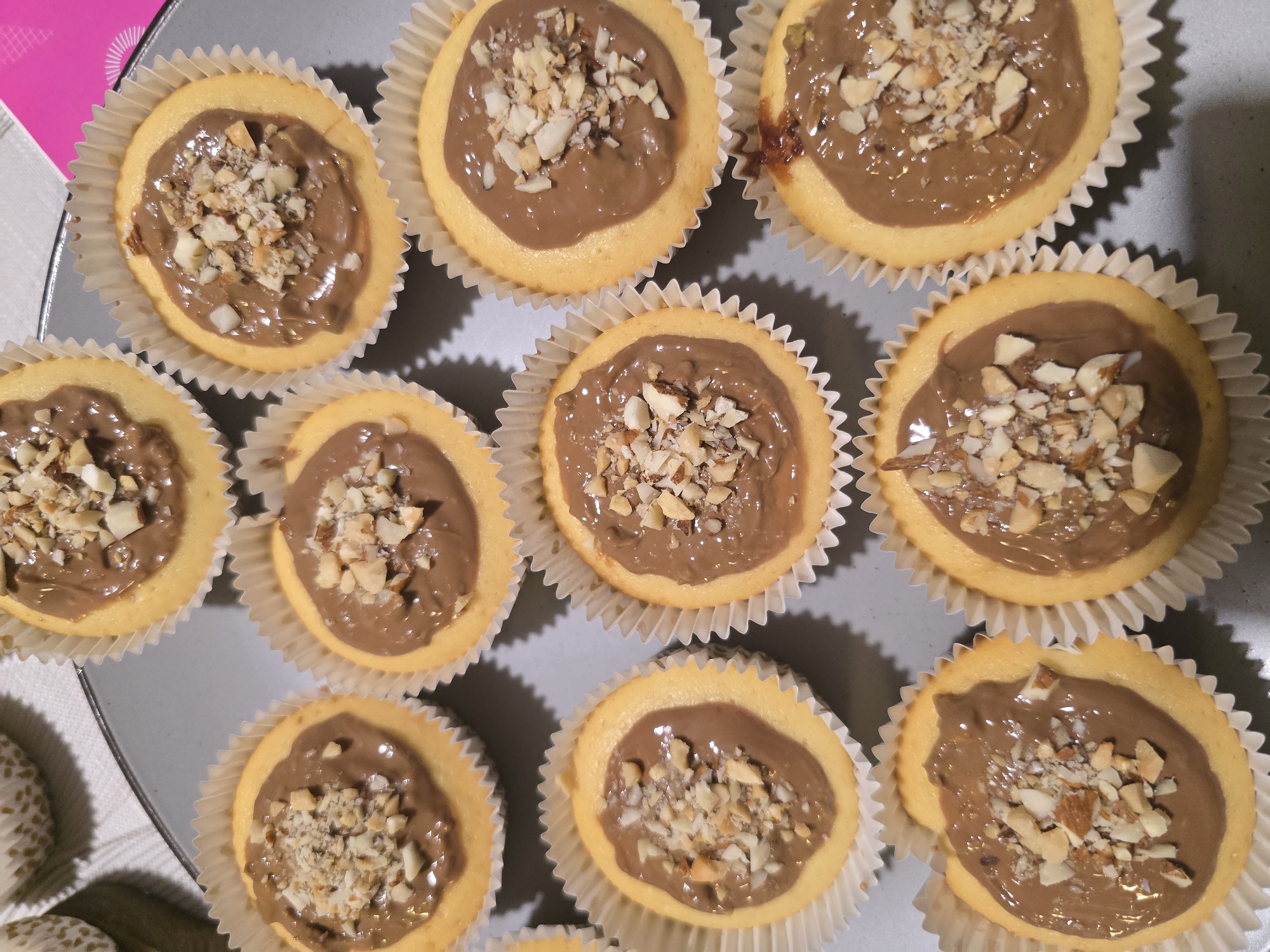 The image displays a close-up, overhead view of multiple prepared small baked goods, identified as cupcakes or muffins, arranged on a grey, flat surface, likely a tray or platter. This scene is situated in the city of German, Bulgaria. Approximately eleven individual items are visible. Each baked good is round, with a pale yellow-gold base, and housed within a white, fluted paper liner. The top of each item is covered with a generous, glossy dollop of light brown spread or frosting, resembling a chocolate-hazelnut variety. Scattered unevenly across the surface of this spread are numerous small, irregularly chopped pieces of light-colored nuts, consistent with almonds or hazelnuts. The items are arranged in an irregular grid, filling most of the frame. In the background, partially visible on the upper right, is a sliver of a bright pink object, possibly a notebook or piece of paper, adjacent to a subtly patterned light-colored surface. No individuals are present in the image.