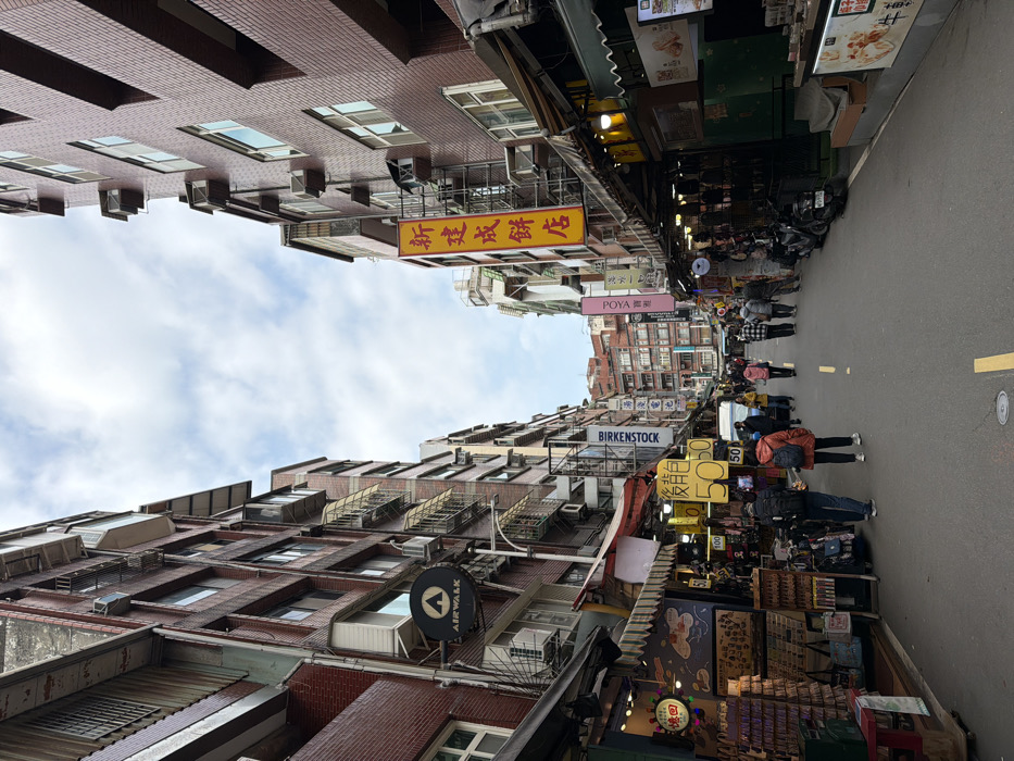 The image captures a bustling street scene in what appears to be a Taiwanese urban area. Buildings line both sides, with a clear sky visible overhead. Signs for AIRWALK and BIRKENSTOCK are prominently displayed, interspersed amongst other commercial signage. A sign reads "新建成餅店" (Xin Jian Cheng Bakery), and "POYA" can be seen further down the street. Street vendors sell various goods along the right side of the street, with multiple people walking through the area.