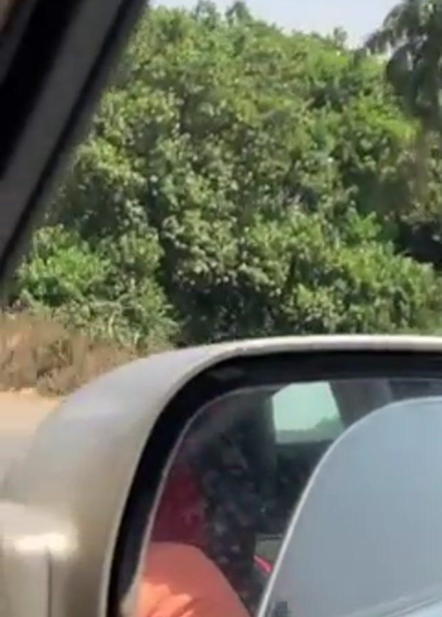 From inside a moving car, the view shows a road with yellow and brown three-wheeled vehicles, also known as auto rickshaws or tuk-tuks. These vehicles are traveling on a road with some vegetation along the sides. The sky is clear and blue. A road sign can be seen in the distance.