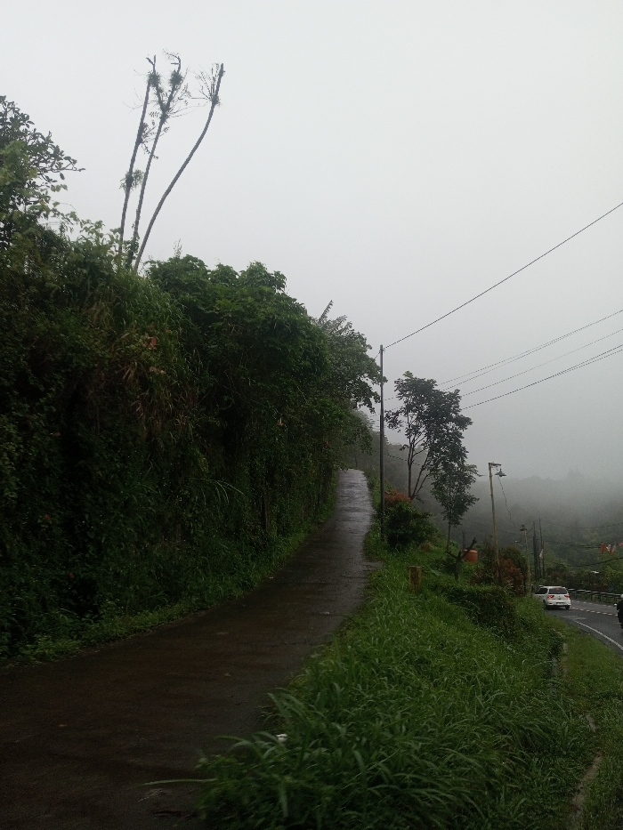A narrow, wet asphalt path climbs a slope alongside dense green foliage. Overhead, power lines stretch into the misty distance. The atmosphere is overcast and foggy, obscuring the background view. A roadside with tall grass, streetlights, and sparse trees borders the path. A white car is visible on the road. The overall impression is one of a secluded, somewhat gloomy, natural environment.