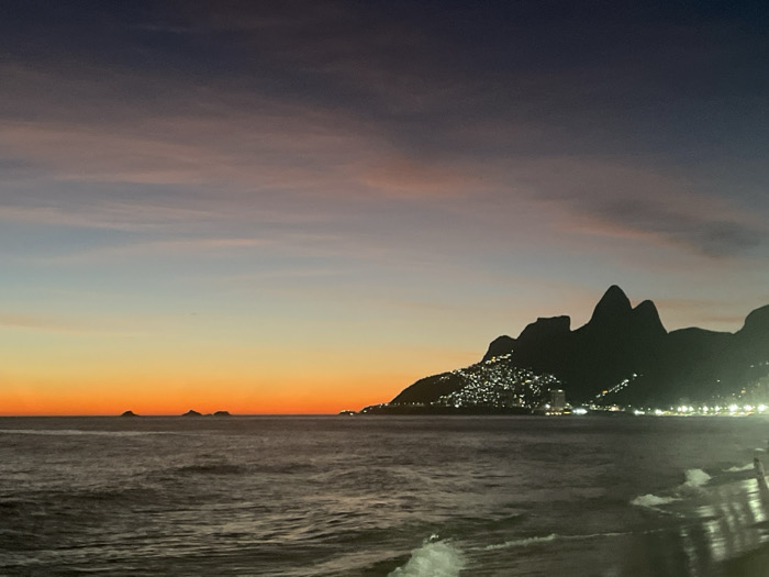 A sunset seascape displays a dark ocean with gentle waves. In the distance, silhouetted mountains rise, with a city nestled on their slopes, its lights twinkling. The sky transitions from a deep blue to pastel pink and a vibrant orange horizon. Small islands are visible on the horizon.