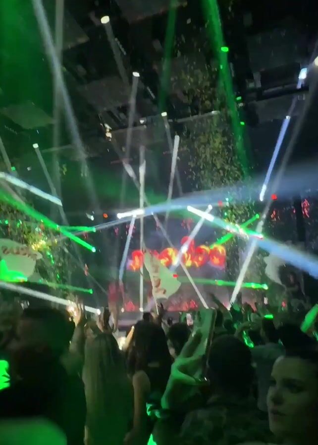 crowded club with a stage and a performer. Confetti is falling from the ceiling. Many people are holding up their phones, presumably to record the performance. There are bright lights shining on the crowd. Later in the video, a young woman wearing glasses poses for the camera with a man. She makes a peace sign. The scene returns to show the crowd and lights.