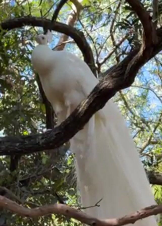 white peacock perched on a tree branch