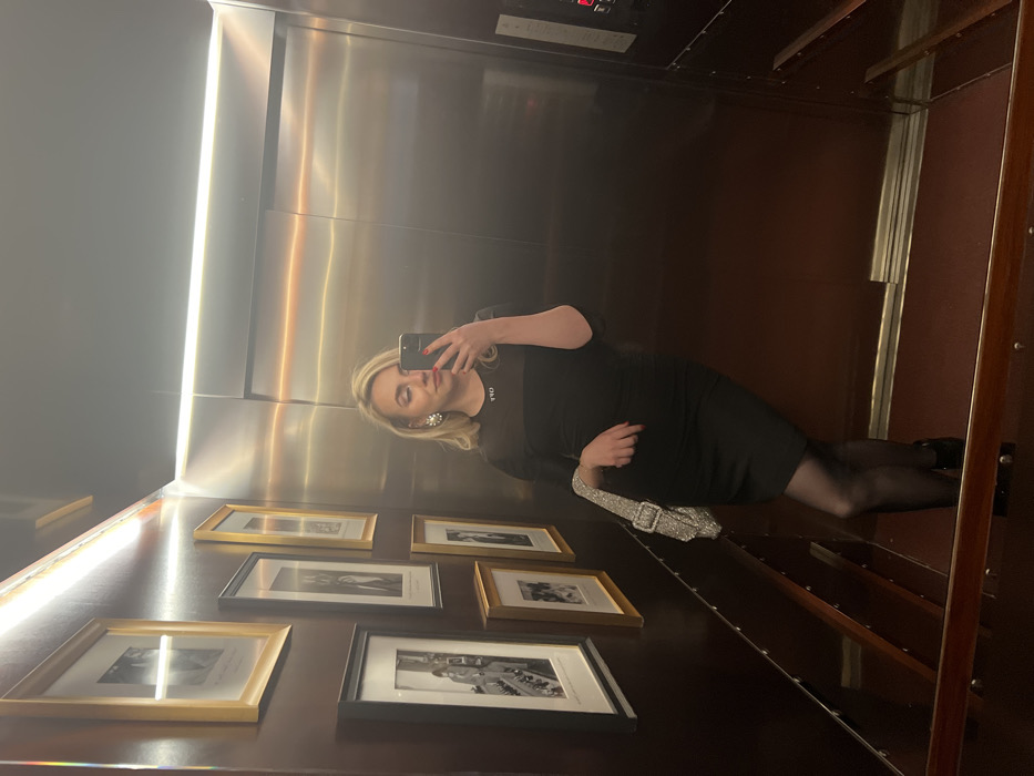 A woman poses in an elevator for a mirror selfie. She wears a black dress and black pantyhose, and carries a sparkly silver purse. The elevator interior features brushed metal walls and a brown wood panel adorned with framed black and white pictures. A bright vertical light strip illuminates the metal wall. The elevator control panel is visible at the top.