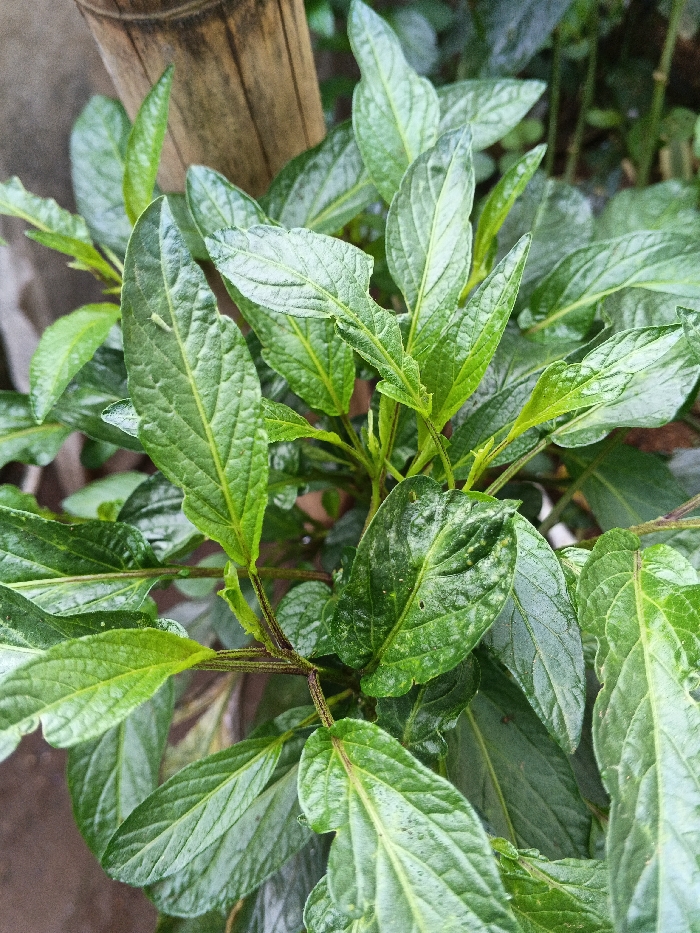 A vibrant green plant with textured, lance-shaped leaves dominates the frame. A few leaves have insect damage. Brown, branching stems support the foliage. A weathered, light-brown wooden post stands near the upper left, contrasting with the plant's freshness. Hints of other greenery blur in the background. The overall impression is one of healthy, leafy growth in a garden setting.