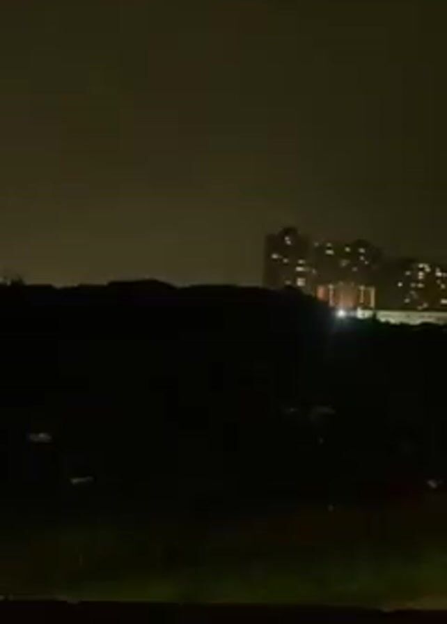 night scene with a dark, overcast sky. In the distance, there's a cluster of illuminated high-rise buildings. In the middle ground is a dark, indistinct stretch of land with scattered cars or objects. The foreground is obscured by darkness. A flash of light occurs briefly in the sky.
