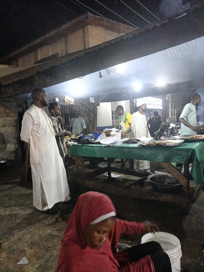 A bustling outdoor market scene at night. Several people stand around a table laden with food, possibly fish. A man in a long white robe stands near the table's edge. Behind the table, other individuals are working. In the foreground, a woman in a red headscarf sits and appears to be preparing something with a white bucket. The lighting is dim, with smoke adding to the atmosphere.
