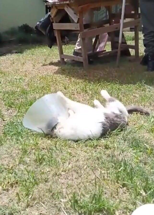 A white and gray cat with a plastic cone around its head is lying on its back in the grass in an outdoor setting. A wooden table with various items on top sits in the background, along with a person standing nearby wearing dark pants and boots. The cat appears to be struggling to get up, and is on green grass. The scene is outdoors, on a sunny day, with some other unidentified objects visible near the edge of the frame.