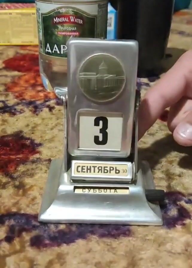 A hand rotates the top date wheel on a desktop perpetual calendar so that it displays the date as "3" of "Сентябрь" or September. The calendar has a small image of a building on its top half, with the words "СУББОТА" or "Saturday" displayed in a window on the bottom half. It's made of silver-colored metal, is on a tan and red patterned surface, and is surrounded by a bottle of water and a box.