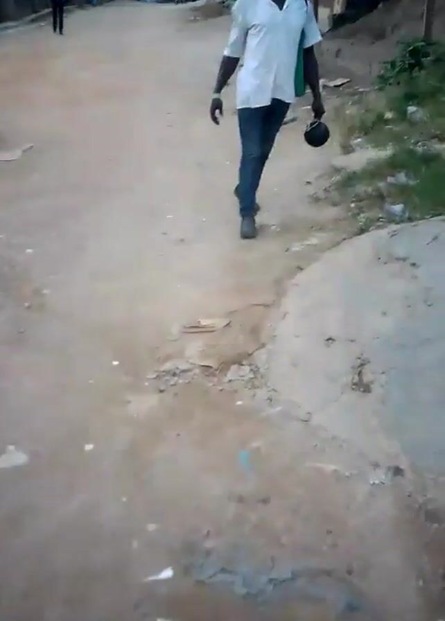 dusty, dirt road in an urban or semi-urban area. A man in a white shirt, jeans, and black shoes walks towards the camera and then past it, carrying something in his hand and a green bag over his shoulder. Another person walks further down the road. The road appears uneven with visible patches and debris. Buildings are visible in the background along the road.
