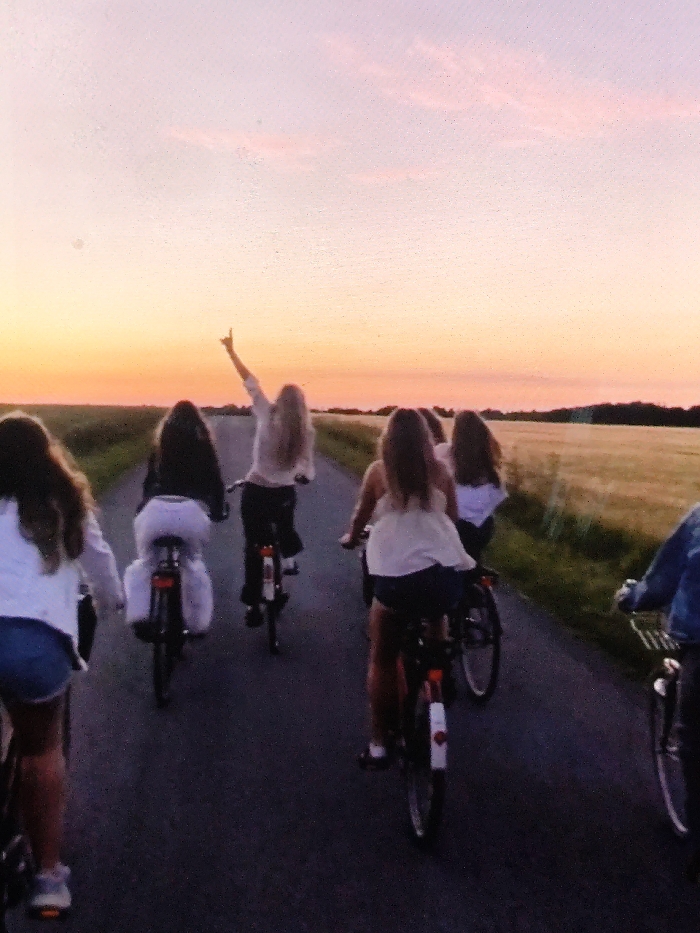 The image depicts six individuals, predominantly young women, cycling away from the viewer on a paved rural road during sunset or sunrise