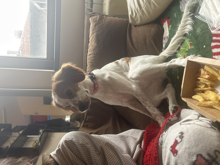 An indoor residential scene in an unknown city features a medium-sized dog and a partially visible human subject on a sofa