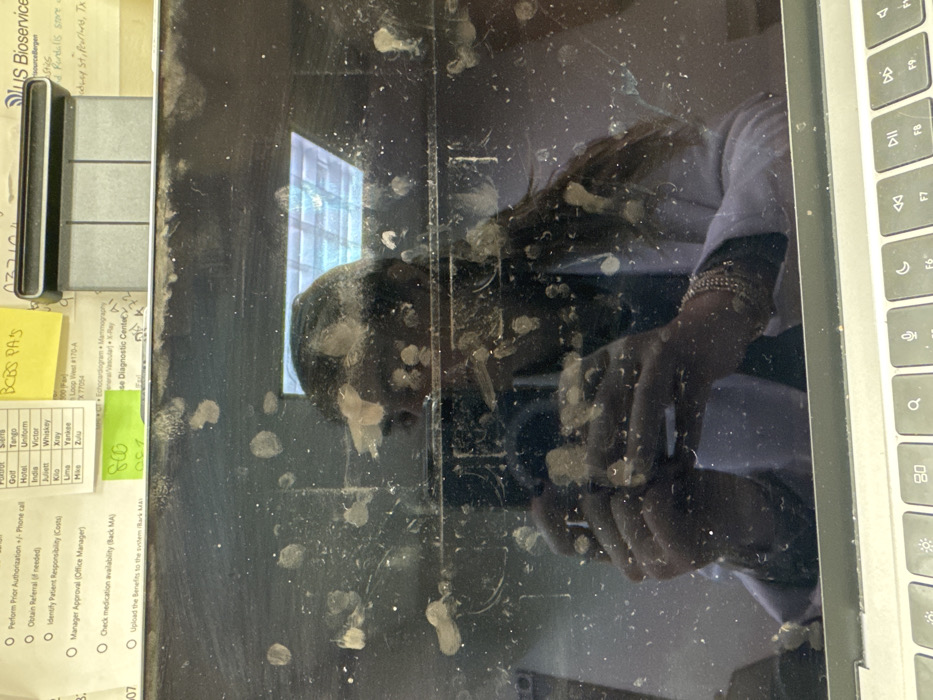 The image displays a person's reflection in a dirty laptop screen, overlaid with visible fingerprints and smudges. The reflection captures the person wearing a white shirt and bracelets, operating the laptop. Adjacent to the screen, a portion of the keyboard is visible. Paperwork with a checklist, possibly related to patient care, and a label with "US Bioservice" are placed beside the laptop. The paperwork includes sections for prior authorization, referrals, patient responsibility, and medication availability. There is a handwritten note on a yellow sticky note.