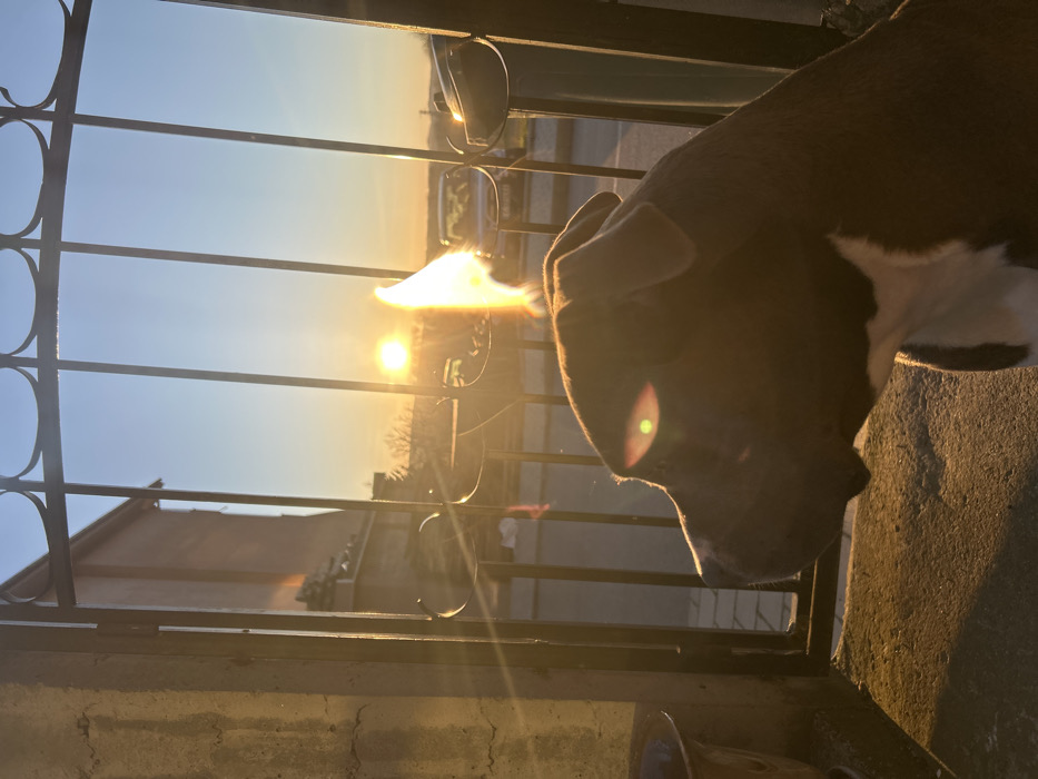 The scene depicts a dark-furred dog, possibly a Pitbull-type breed with white chest markings, positioned in the foreground at ground level in Aheloy, Bulgaria. The dog is facing left, with its right side illuminated by intense, low-angle sunlight, producing a strong lens flare over its right eye area. It is situated behind a dark metal gate consisting of vertical bars and decorative curved elements. Beyond the gate, a paved street or driveway is visible. A light-colored vehicle, possibly a car or van, is parked or driving on the paved surface. To the left, a multi-story building with reddish-brown exterior walls is discernible. The horizon features sparse, leafless vegetation. The sky is clear blue, transitioning to bright orange-yellow near the horizon, indicating either sunrise or sunset. The sun, a brilliant disc, is positioned in the upper middle-right of the frame, emitting strong light rays and a prominent vertical lens flare that passes through the gate. The immediate ground surface where the dog rests appears to be concrete or similar paving. A dark, circular object, possibly a pot or bowl, is visible on the ground to the far left. No human subjects are discernible.