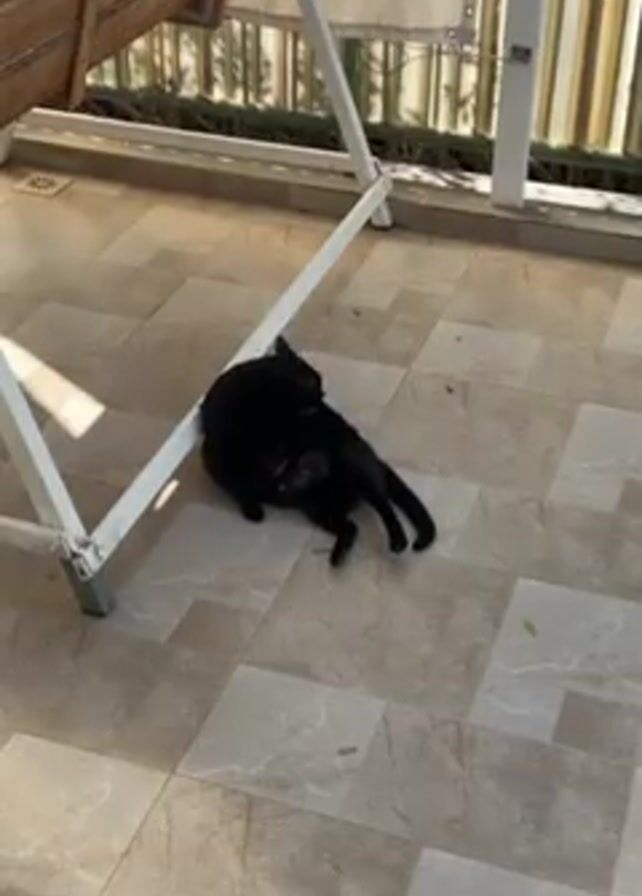 A black cat sits on a tiled floor next to the white metal frame of an outdoor swing. The cat is grooming itself. The swing is partially visible at the top of the frame. In the background, there are plants behind a white fence.