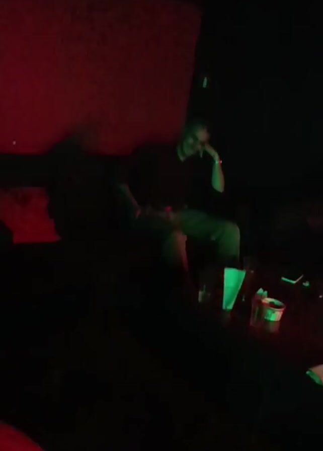 A man is sitting on a couch in a dark room, illuminated by colored lights that shift between red, green, and blue. He's wearing a dark-colored shirt and light-colored pants. He has one hand on his face, resting near his chin, and his legs are slightly spread. In front of him is a low table with several cups and glasses on it. The room appears to be a lounge or club setting. There is movement in the scene, but it is not clear what is moving.