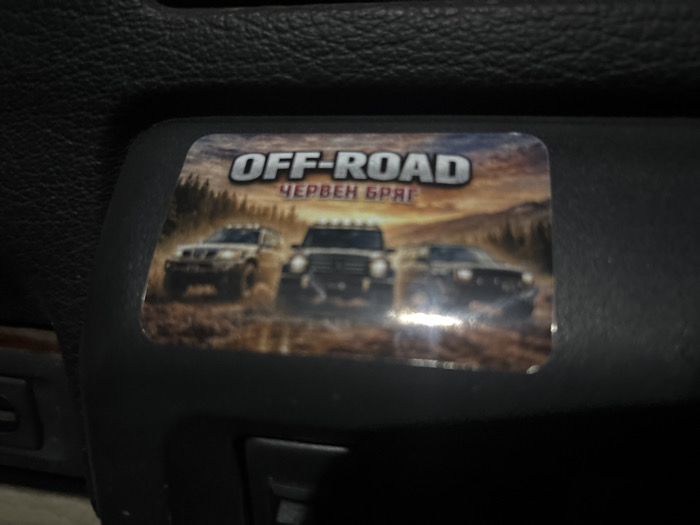 A rectangular sticker with rounded corners is affixed to a textured, dark gray or black plastic surface, likely within a vehicle interior