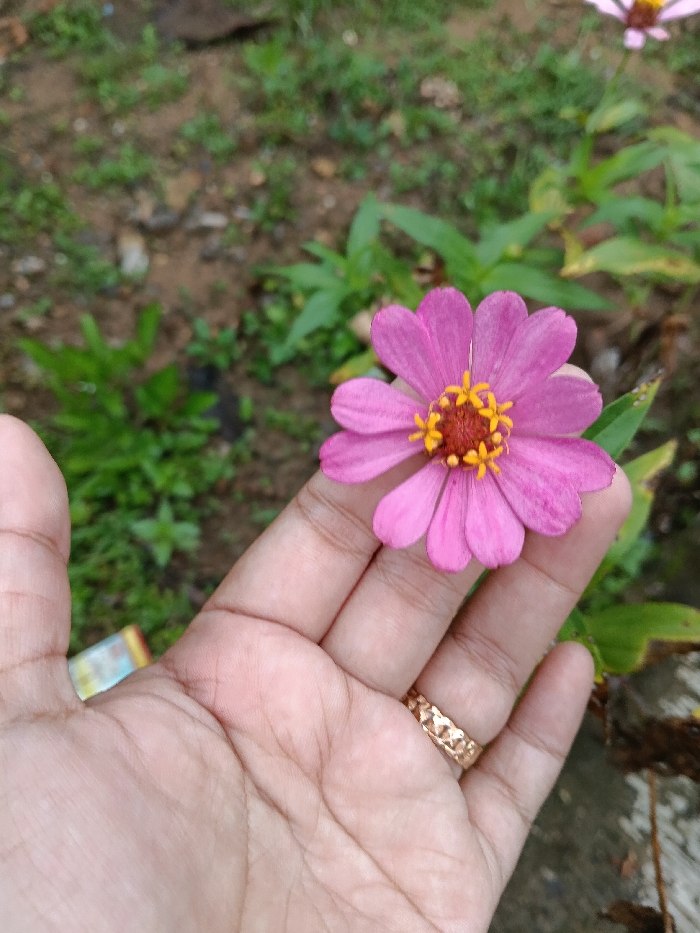 A hand holds a pink zinnia flower with a yellow center. The hand is adorned with a gold ring. The background is filled with lush green vegetation and some brown dirt. The flower is the main focus, contrasting with the skin tone of the hand. The overall image gives a sense of nature and delicate beauty. Another, out-of-focus, zinnia is in the upper-right portion of the frame.