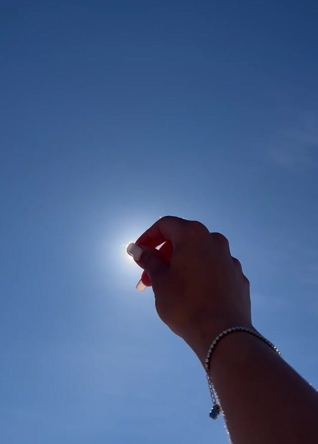 A single arm and hand stretch upwards against a bright blue, cloudless sky, obscuring the sun. The hand features a ring and long, white-tipped nails. The arm sports a thin bracelet and appears to be tanned. The sun's rays create a bright lens flare and silhouette the hand and arm.