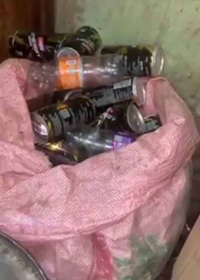 pink checkered bag filled with discarded items. Visible within the bag are numerous empty cans, primarily of what appear to be energy drinks, along with a few plastic bottles. The bag is situated in what seems to be an enclosed space, possibly a room or storage area. A metal object, likely a pot or bucket, is visible to the lower left of the bag. The lighting is dim, contributing to a somewhat cluttered and unkempt appearance.