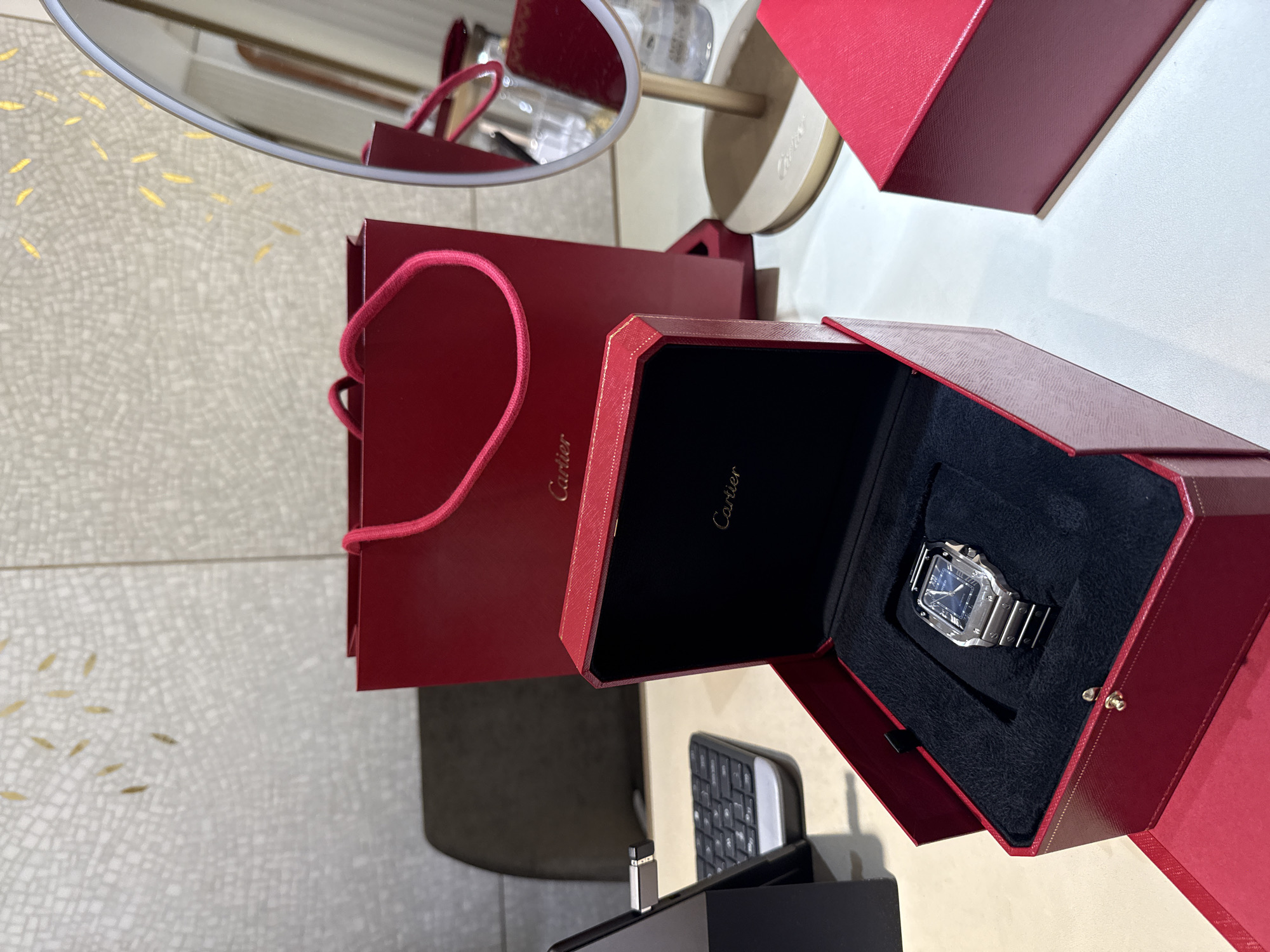 A stainless steel Cartier Santos de Cartier watch, featuring a blue dial, is presented within an open red Cartier watch box lined with black velvet. The box rests on a light-colored counter, likely a sales desk. Directly behind the open box is an upright red Cartier shopping bag with red string handles, displaying the Cartier logo. To the right of the watch box, a red rectangular Cartier outer box is partially visible, next to a round, gold-framed vanity mirror on a gold stand. The mirror's reflection shows elements of the room, including what appears to be a clear glass bottle. On the far left, a black tablet computer with an attached keyboard and a USB device is visible. The background consists of a light-colored wall with a textured pattern, punctuated by abstract gold, leaf-like metallic accents. A dark chair is partially visible in the left background. The scene is consistent with a luxury retail environment, specifically the Cartier boutique located at Voukourestiou 7, Athens, Greece.