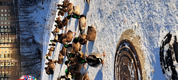 The image depicts a winter scene in Novoe Devyatkino, Russia, under bright sunlight. The foreground is covered in fresh snow, where a large group of approximately 30-40 mallard ducks (Anas platyrhynchos) are resting and standing. Many drakes, identifiable by their iridescent green heads, are visible amongst the group. In the lower-left, a rusty, circular metal manhole cover is partially embedded in a concrete base, with snow accumulated around it. Below this, the edge of a snow-covered black tire is visible. The midground features a snow-covered embankment populated with numerous bare deciduous trees. In the background, several multi-story residential buildings with light-colored facades, multiple windows, and balconies are illuminated by the sun, indicating an urban or suburban setting. No people are visible.