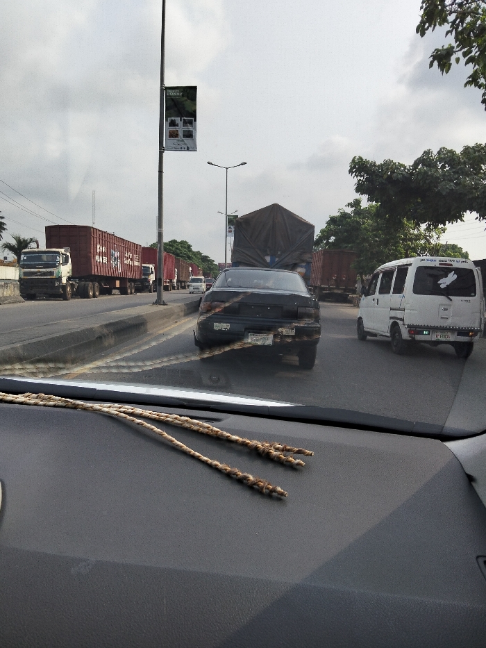 The image, captured from within a vehicle looking forward through the windshield, depicts a busy, multi-lane roadway in Port Harcourt, Rivers State, Nigeria, under an overcast sky. In the immediate foreground, two parallel, braided light brown rope-like objects with frayed ends rest horizontally on a dark gray dashboard. The midground features a concrete median separating lanes of traffic. On the observer's side of the median, directly ahead, is a dark-colored sedan with significant visible damage to its rear bumper and a "RIVERS STATE" license plate. To the immediate right of the sedan, a white commercial van with a distinctive black, abstract decal on its rear window is positioned. Further down the road on the right, a large truck with a brown tarpaulin covering its load is visible. A solitary individual is discernible standing near the right side of the road by the white van. On the opposing side of the median, a queue of at least five articulated lorries, each carrying a red-brown cargo container, extends into the distance. The first visible lorry has a white Volvo truck cab. A tall, dark street light pole stands centrally on the median, featuring a vertical banner with images and partially legible text, including "GREEN CORNY." Another similar street light pole with a banner is visible further ahead on the right side of the road. The background shows additional vehicles, mostly trucks, and scattered green foliage from trees along the roadside. The sky is uniformly light gray and overcast. The scene indicates vehicular congestion.