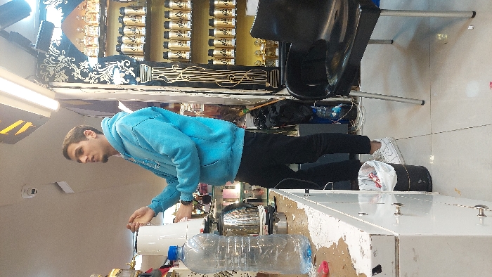 A man in a blue hoodie and black pants stands beside a cluttered countertop. He appears to be interacting with a machine or setup. A large, clear plastic bottle sits near the front edge of the counter. Shelves of small, dark bottles line the wall behind him, decorated with gold accents. A black office chair and other objects are visible in the background. The setting suggests a retail or commercial environment.